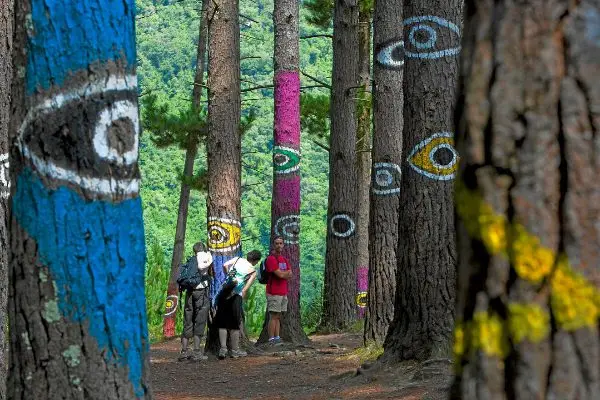 Los árboles pintados de Oma, aparecen a nuestro paso según recorremos las más de 47 obras de arte que lo componen. Debemos mencionar, que estas obras de arte están formadas por la visual que nos ofrece ver varios árboles pintados desde un punto de vista en concreto.